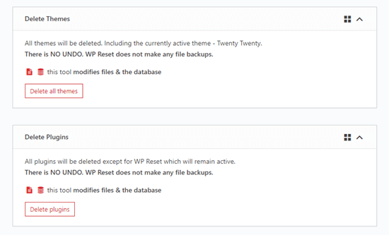 Important: WP Reset doesn't backup your files in whatever way. Deleting your themes and plugins can't be undone.