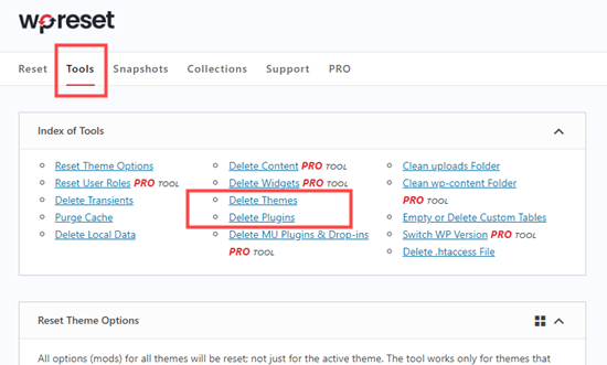 Offset, you'll need to go to Tools » WP Reset and click the 'Tools' tab. Once there, simply click on the 'Delete Themes' or 'Delete Plugins' links to jump straight to those tools.